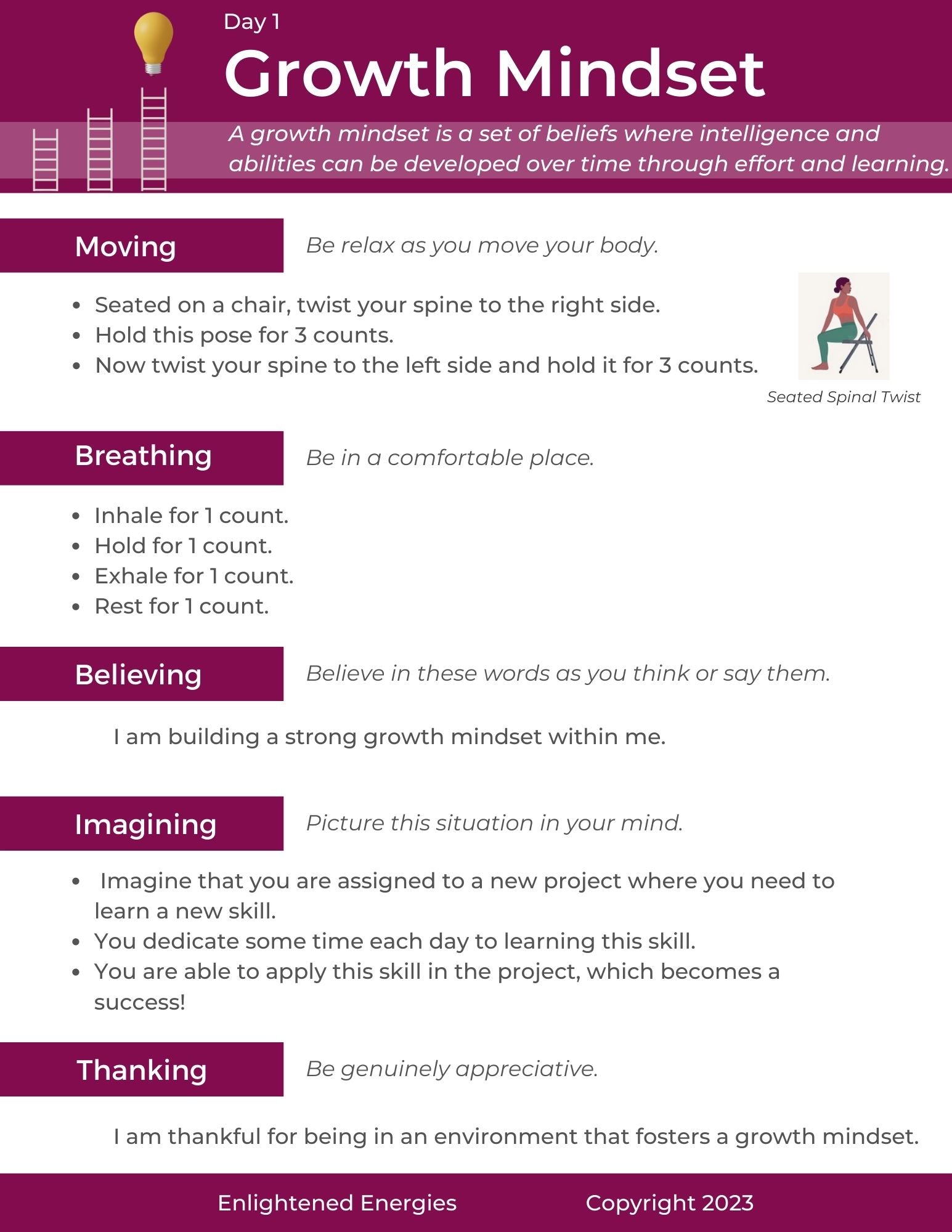 This 7-day 'Mindful Moments' corporate meditation program (Adult version) has been created to cultivate an evolved mindfulness practice in the workforce. Each day in this meditation has various themes related to the corporate world while exploring activities such as movement, breathwork, affirmation, guided visualization, gratitude and reflection. It also includes bonus materials such as journaling, quotes, tips, puzzles and other materials to empower you.